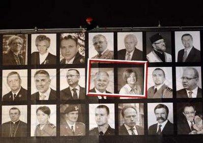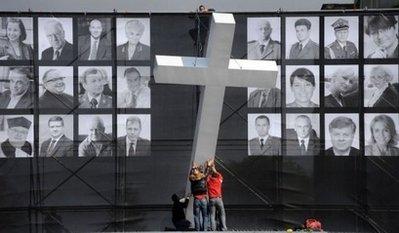 在波兰首都华沙皮苏特斯基广场,搭建的台子展示了所有空难遇难者照片