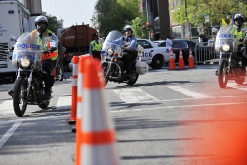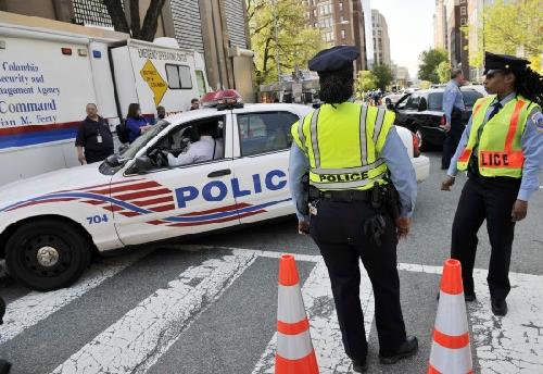 4月12日,在美国首都华盛顿,警察在核安全峰会会场外执勤。新华社记者张军摄