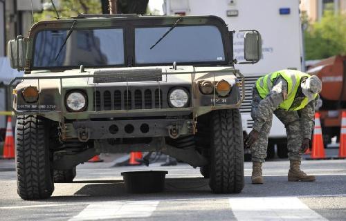 4月12日,在美国首都华盛顿会议中心附近,一名士兵检查自己的车辆。新华社记者张军摄