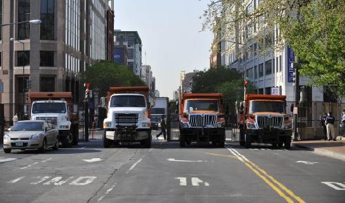 4月12日,在美国首都华盛顿,几辆用来封堵道路的大型卡车停在核安全峰会会场附近。新华社记者张军摄