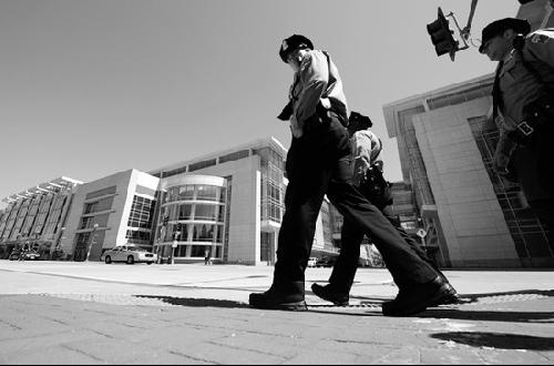 核安全峰会开幕前,美国警察在会场外加强警力戒备