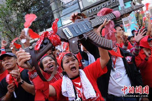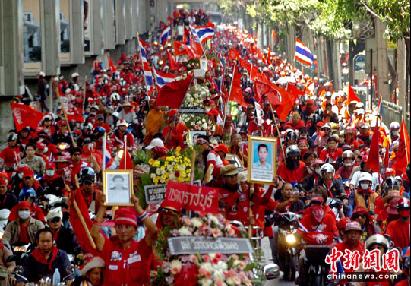 当地时间4月12日,泰国红衫军在曼谷市区抬着棺材举行游行,借此向政府施压促阿披实下台。此前红衫军示威者与军警发生冲突,造成21人死亡。图片来源:中国新闻网