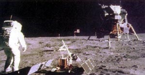 “阿波罗11”号飞船由指挥舱、服务舱和登月舱三部分组成。7月21日3时51分,登月舱在两名宇航员N·A·阿姆斯特朗和E·E·奥尔德林操纵下,在月球实现软着陆。另一名宇航员柯林斯则留在指挥舱内,继续沿着环月轨道飞行。阿姆斯特朗爬出登月舱的气闸式舱门后,从5米高的进出口缓慢地走下9级扶梯。4时7分,他的左脚先放到月球表面,静寂的月球尘土上第一次印上了人类的脚印。阿姆斯特朗和奥尔德林在月球上停留了21小时18分钟,除安装大量测试装置外,还采集了23公斤月球岩石和土壤样品,然后驾驶登月舱上升级返回环月轨道与母船会合对接,飞向地球。