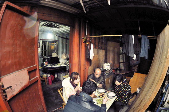 老徐一家的住房梦:在老徐一家心里,集装箱是一个住房梦。图为2014年2月24日,浙江义乌宗塘村附近的江边,集装箱的雨棚下,老徐一家人在吃晚饭。老徐原来住在宗塘村的棚户区,后来以年租金4500元租下了这个集装箱,用画布分隔成两居室,供他和妻子以及儿子、儿媳居住。(东方IC供图)
