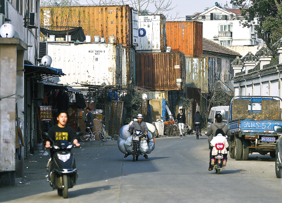极简陋的集装箱住宅:在蜗居时代,并非没有人看到廉价的废弃集装箱所带来的商机。图为2013年3月8日,上海市郊,当地村民利用废弃集装箱,经过加工改造,建成简易住宅,租给城市农民工。这些堆叠起来的集装箱里,住着不同的家庭,“房东”能从每个集装箱收取500元的月租金。(东方IC供图)