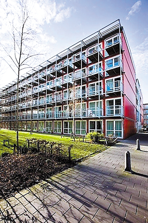 深受法国年轻人追捧:法国的房地产企业还专门开发出集装箱住宅区,这些住宅多为三居室,设计使用寿命100年,售价只有常规住房的二分之一,深受年轻人的追捧。图为法国勒阿弗尔的集装箱大学生公寓,四层楼由100个集装箱建成,外形简洁明快,富有现代气息,可谓新一代蜗居的典范。