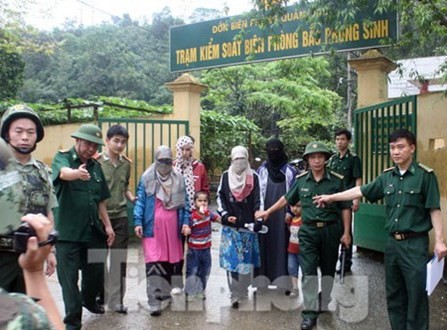 4月18日,16名中国非法移民与越南边防警察发生枪战。已造成至少2名越南边防警察和5名中国人死亡。图为越南边境警察在越南广宁省边境入口遣返中国非法移民。