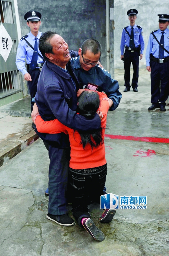 4月15日,在广东省坪石监狱会见室所在的平房小院里,犯人韩某远与15年未见的父亲和姐姐,相拥痛哭。