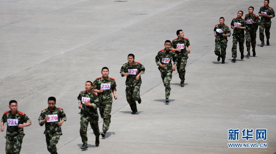 新华社照片,南京,2014年4月23日 赶考“武状元” 4月23日,战士分组进行5公里跑课目考核。当日,武警江苏总队一年一度的院校招生军事技能考核在某训练基地举行,来自全省基层单位的200余名武警战士参加了队列、擒敌、战术、射击等多个军事课目的竞技。此次军事技能考核为期2天,参考战士通过后方能参加6月7日、8日由武警部队统一组织的招生文化考试。据悉,武警部队军事院校招生统考为战士们提供了一个实现“警官梦”的机会,只有通过军事、文化“两关”,才能被军事院校正式录取。新华社发(李科 摄)
