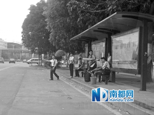 昨日上午10时许,凤岗街头的公交站台,三三两两的市民在等待公交。