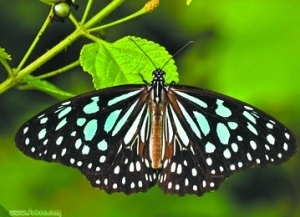 “在广州最常见的蝴蝶是青斑蝶。”焦劲峰说。青斑蝶又名粗纹斑蝶、淡色小纹青斑蝶、淡纹青斑蝶等,属于斑蝶科青斑蝶属。“该蝶体型中等,翅膀正面是黑褐色,自翅基部发出若干浅青蓝色条斑,中域及以外个翅室内均散布浅蓝色斑。看起来就像翡翠玉石上的天然条纹。”焦劲峰说。