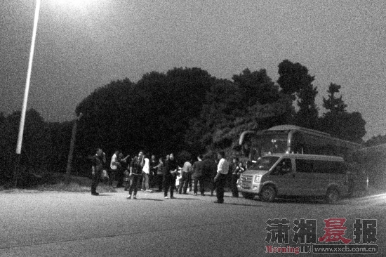 4月18日晚上7时许,村民用面包车横在旅游大巴前,欲阻止其离开未果。图/潇湘晨报记者 刘伟