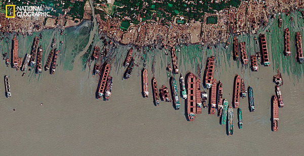 孟加拉拆船厂俯拍图。在孟加拉一条长达13公里的海岸线上,分布着80家拆船厂。