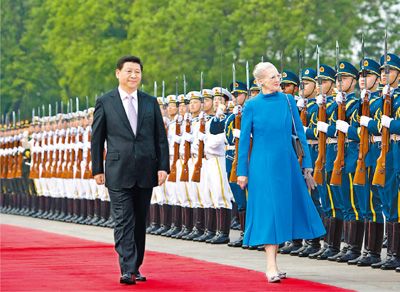 2014年4月24日,国家主席习近平在北京人民大会堂同丹麦女王玛格丽特二世举行会谈。这是会谈前,习近平在人民大会堂东门外广场为玛格丽特二世举行欢迎仪式。