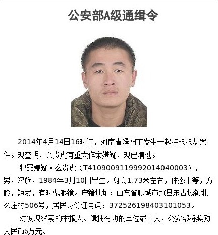 此前,公安部刑事侦查局官方微博发布消息称,2014年4月14日16时许,河南濮阳发生一起持枪抢劫案。经查,么贵虎(男,汉族,1984年3月10日出生,身高1.73米左右,体态中等,方脸,短发,有时戴眼镜)有重大作案嫌疑,已潜逃。对发现线索的举报人、缉捕有功的单位或个人,公安部将奖励人民币5万元。