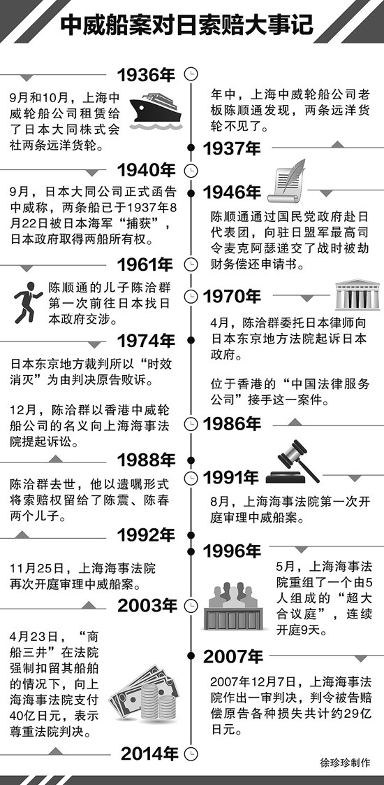 此后,陈顺通不断通过各种途径查询两条船的下落。3年后的1940年9月4日,日本大同公司正式函告中威称,两条船已于1937年8月22日被日本海军“捕获”,日本政府“依法”取得两船所有权,并由日本递信省(即交通部——记者注)通过订立租船合同将两船再交予大同公司营运。