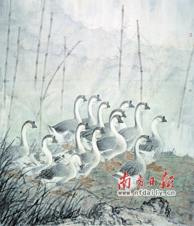 在许晓彬的笔下,青溪、渔网、鹅群、嫩草,跃然于纸绢之上,浑如一个亘古不变的水乡田园之梦,带着一抹缥缈的原乡情怀,以及一丝惹人遥想的“画外之意趣”。观众全然感觉不到现代生活被电子化、工业化、全球化所充斥之际,人心流露出的焦灼与浮躁;相反,体会到的是一份在追忆与现实之间回荡的从容与淡泊。