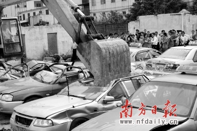 交通执法部门在永泰客运站附近集中销毁一批克隆出租车。 南方日报记者 符超军 摄