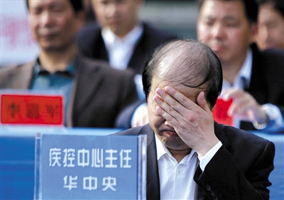 4月23日下午,陕西省商南县广场问政活动上,因县疾控中心私设小金库,中心主任华中央当着众多群众的面被当场免职,随后他掩面而泣。华商报记者魏光敬摄