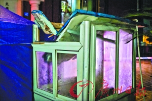 记者昨天傍晚6时左右赶到现场,看到被砸的保安亭西北角塌陷,保安亭内外满是碎玻璃和支离破碎的铝合金窗。