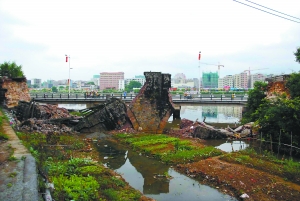 记者现场看到,该桥已被拆毁成两节,嵌在桥梁中的方条形红砂岩石块散落在河道中心,部分已被河水淹没,2个桥孔已荡然无存,桥中间仅存一座残缺的桥墩孤零零地立在河道中间,桥梁两端分别立起两块“此处危险,禁止通行”的警示牌,并拉起了警戒线。