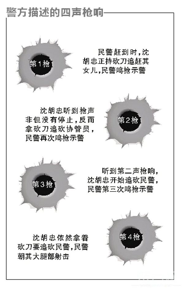 “事发当时,该男子拿着菜刀追砍家人后,又开始追砍警察,民警在多次鸣枪警告无效的情况下,才开枪制止其行为的,民警用枪属于合理合法的行为。”东川区公安局一名工作人员介绍,事发时沈胡忠喝过酒,正在实施家暴,用刀追砍其妻女,妻子才报警的。出警的是新村派出所的民警和一名协管员。民警赶到现场时,沈胡忠仍然拿着砍刀在追赶其女儿,民警立即鸣枪示警;沈胡忠听到枪声后,非但没有停止其行为,反而拿着砍刀追砍出警协管员,民警再次鸣枪示警;听到第二声枪响后,沈胡忠又开始追砍出警民警,民警第三次鸣枪示警;之后沈胡忠依然拿着砍刀要追砍民警,民警才开枪制止的,而且枪是朝着其大腿部射击的。