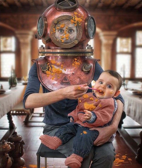 照片中,超级奶爸约翰正给六个月大的小女儿尤娜喂食,画面十分奇幻