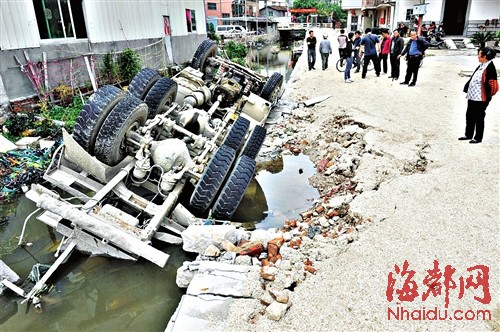 据西洪村村主任林先生介绍,事发村道刚建好约2个月,由于道路靠近河沟,为软基路面,加上未铺设水泥,道路的承重能力较差,所以发生塌陷,车掉进河沟中,村里今后或打算在路面上铺设水泥。