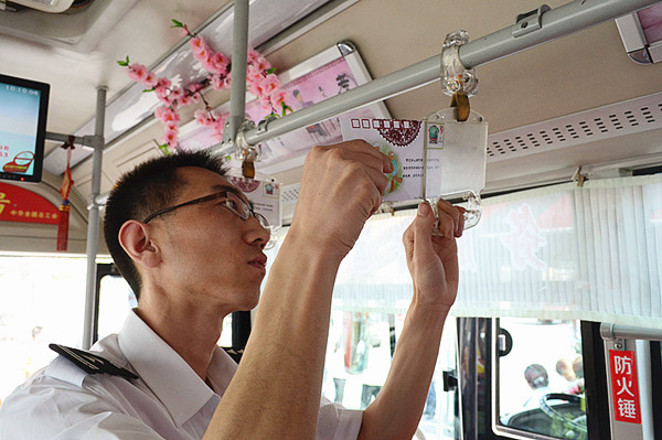 公交驾驶员正在给拉手安装宣传孝文化的明信片