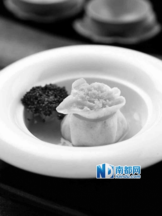 在潮汕祖先发明“富贵石榴球”这道典型的庆典菜式时,它是以满盆满钵的形式端上餐桌的,情形相当豪放。不过现在这道土豪气息的菜竟然典雅起来,每个小碟中一个“石榴球”,全部一席白衣,扎着精致的绿色蝴蝶结,简直就是《窈窕淑女》里的奥黛丽·赫本。