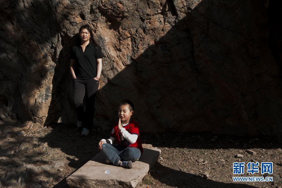 张荣花与中国稀有血型联盟的志愿者聚会时,在北京郊外一座山上留影,活泼的儿子坐在前面不肯离开(3月29日摄)。