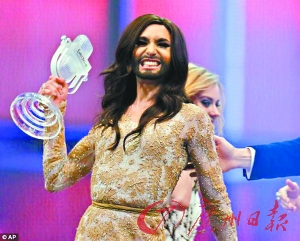 本报讯 远看是温柔妩媚的窈窕女郎,近看却可能被一脸粗犷络腮胡“亮瞎眼”——这就是今年欧洲歌唱大赛冠军肯奇塔·沃斯特阴柔又阳刚的怪异造型。也许这位异装男歌手的外形不为大多数人所认同,但他的歌声和表演却征服了观众,在10日晚的欧洲歌唱大赛决赛中代表奥地利胜出。