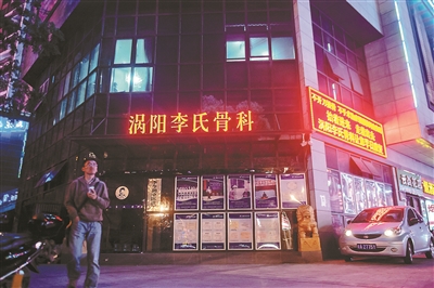 记者看到,诊所的玻璃墙上,张贴着“李某某”的商标注册证,以及诊所主治医生李某某与几位顾客专家、国外同行的合影。“不开刀接骨,不手术治疗颈腰椎间盘突出,抬着进来,走着出去。”门外的霓虹灯广告标语很显眼。