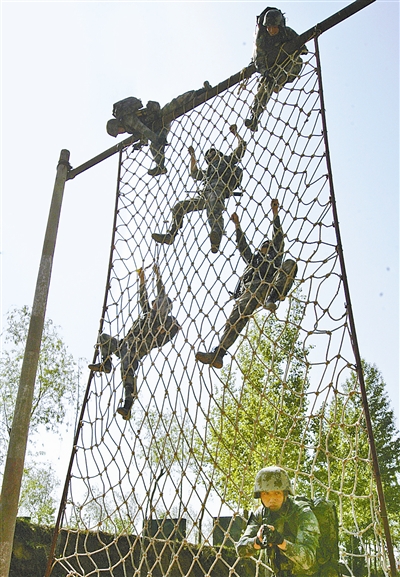 左图:4月下旬的一天,陆军第47集团军某旅组织驻训官兵进行攀爬网墙训练。该旅针对青年官兵不怕挑战、敢于争先的性格特点,引导他们把顽强斗志转化为磨砺打赢真功的实际行动。王英楠摄