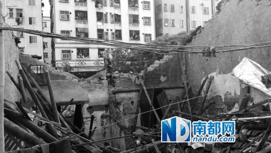 前日下午,塘厦诸佛岭沙龙村的外来工民房聚集地,一老房因水浸洪灾坍塌。南都记者 吴雪峰 摄
