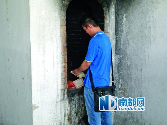 莫先章为妻子烧纸送别。南都记者 熊晓艳 摄