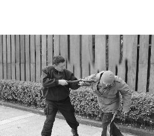 李旭认为,末端比较尖的长柄伞更有优势,毕竟兵器讲究一寸长一寸强。“当我们行走在路上时,有歹徒欲实施抢劫。面对歹徒,握紧长柄雨伞击打对方持刀的手腕,然后,顺势用伞尖端刺向歹徒的咽喉,或者刺向耳后凹陷处。如果情况合适,还可以收回伞尖,再用伞把手攻击歹徒裆部。当歹徒因疼痛而弯腰时,用膝关节猛击歹徒下颚。”