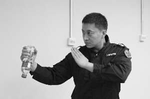 “矿泉水瓶是椎体状,椎体的尖部是水瓶的盖儿,这个位置非常坚硬。在进行防守的过程中,使用这个坚硬处,向对方的要害部位(咽喉、双目、心窝等)进行击打,我们做过实验,击打效果是很明显的。”