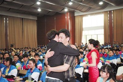 李锦鉴在唱完《父亲》后和父亲拥抱。 铁路中学供图