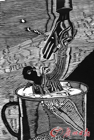 刘庆元一直在用木刻写日记,把日常生活每天每时都刻进作品中,好留下一份时代的心志。重要的是,刘庆元着力恢复木刻所固有的文学性,而这文学性又和张贴在墙上的感觉重合,让叙事成为主题,其中不无荒谬。