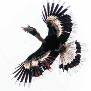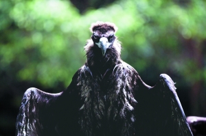 《“神雕”衔礼》 曾水村 摄 评语:此作品很容易从海量参赛作品中脱颖而出。作者采用仰拍,大胆舍弃了环境信息,而选择这个“无背景”的背景来突出动物形体本身。不看图片说明,此图更像动物标本。虽是捕捉动态瞬间,看来却似静物,将其视为标本,不失为另一种解读方式。