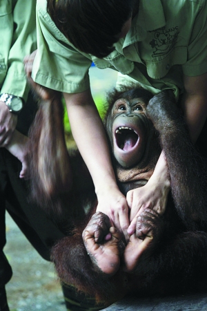 《别咯吱我,痒》 李克利 摄 评语:读者在此可找到两种代入感,一是感觉自己也被挠了一下,一是自己是那个挠猩猩的人。对人物作不露正脸的处理,给读者更多的想象空间和代入感,这个人,可以是任何人。