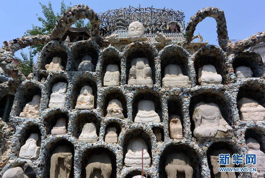 新华社照片,天津,2014年5月19日 津门瓷房子——狂热的“艺术乌托邦” 瓷房子正门前,用碎瓷片嵌成的一个个佛龛内,摆放着不同程度损坏的历代石窟造像(5月17日摄)。 天津“瓷房子”—— 一座镶嵌了4亿多古瓷片、5000多个古瓷瓶的中国古瓷博物馆。瓷房子楼体本身为一座有着100多年历史的法式五层小洋楼,室内虽有不少展品,但最“吸引眼球”的是建筑装饰。在这里,游客会有“眼睛不够用”的感觉,整栋建筑的每个角落都充满精致的艺术品和文物,它们大都被粘在墙上。除了数亿块古瓷片外,还有大量完整的瓷碗、瓷盘、瓷瓶、瓷枕等,所用瓷器年代从汉代一直跨越到清代,包括宋代五大名窑、龙泉窑、耀州窑等,几乎涵盖了各个历史时期的瓷器精华。瓷房子的主人张连志是当地一位民间收藏家,收集这些瓷器用了20多年时间。曾有人质疑,用古董装饰墙体是对文物的破坏。但张连志认为,贴在墙上屋顶上的瓷器其实都是残缺的。而一些石雕、瓷瓶镶嵌在墙上,实际上是换了一种陈列方式。他希望用艺术的神奇,让这些本来就已“受伤”的瓷器,重新面对世人,让大家都来关注中国文化,感受中国瓷器的魅力。新华社记者王颂摄