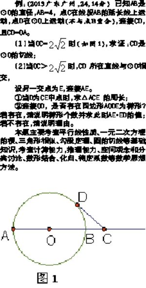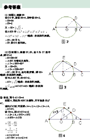 第(2)问第②小题关键是判断OD∥AE的可能性.根据四边形AODE为梯形判断到只能是OD∥AE是难点,也是关键点。巧妙利用△OED∽△CEO及CE=AE,计算出AE·DE=CE·DE=OE2=4。有圆的对称性可知,存在两个梯形。