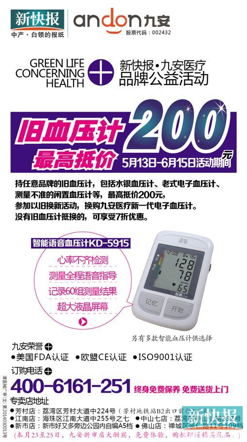 近日,上市公司九安医疗联合新快报,开展绿色公益活动——血压计以旧换新,市民持任意一款旧的血压计,到授权换购点,可最高抵价200元,换购九安新一代电子血压计,该举措旨在让更多高血压患者,同欧美高血压患者一样,可以享受简便环保的医疗待遇。