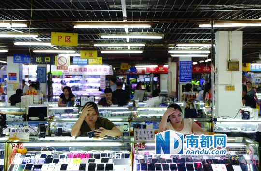 5月19日,将军东电器城二楼,二手手机贩卖商在大厅里营业。 南都记者 张志韬 摄