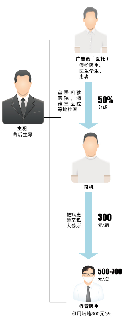 廖某供称,团伙成员分别假扮医生、医生学生、患者、医院司机等。“其中假扮的医生、医生学生、患者等我们叫广告员(医托),后续环节会根据‘广告员’反馈的病人病情和经济状况来决定病人的疗程,说穿了,就是决定这次诊疗能骗多少钱。”