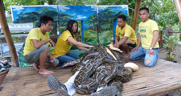 菲律宾5米长巨蟒为游客按摩 需先喂10只鸡防其吃人(高清组图)
