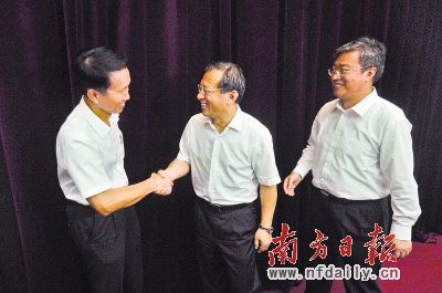 佛山新一轮权力交接已于22日完成。赴穗履新的李贻伟与刘悦伦和鲁毅临别握手。