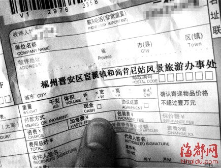 昨天下午,记者电话联系了晋安区旅游局,办公室工作人员王小姐说,辖区内并无叫做“和尚背尼姑”的风景区。记者随后联系宦溪镇旅游办主任林冰,再三确认后,林主任说在宦溪镇官田林场附近有块石头因为形似“和尚背尼姑”,被附近村民叫做此名。“这算不上风景区,更无办事处。”林主任表示,照片中快递单上的地址实际上是不存在的。![]()